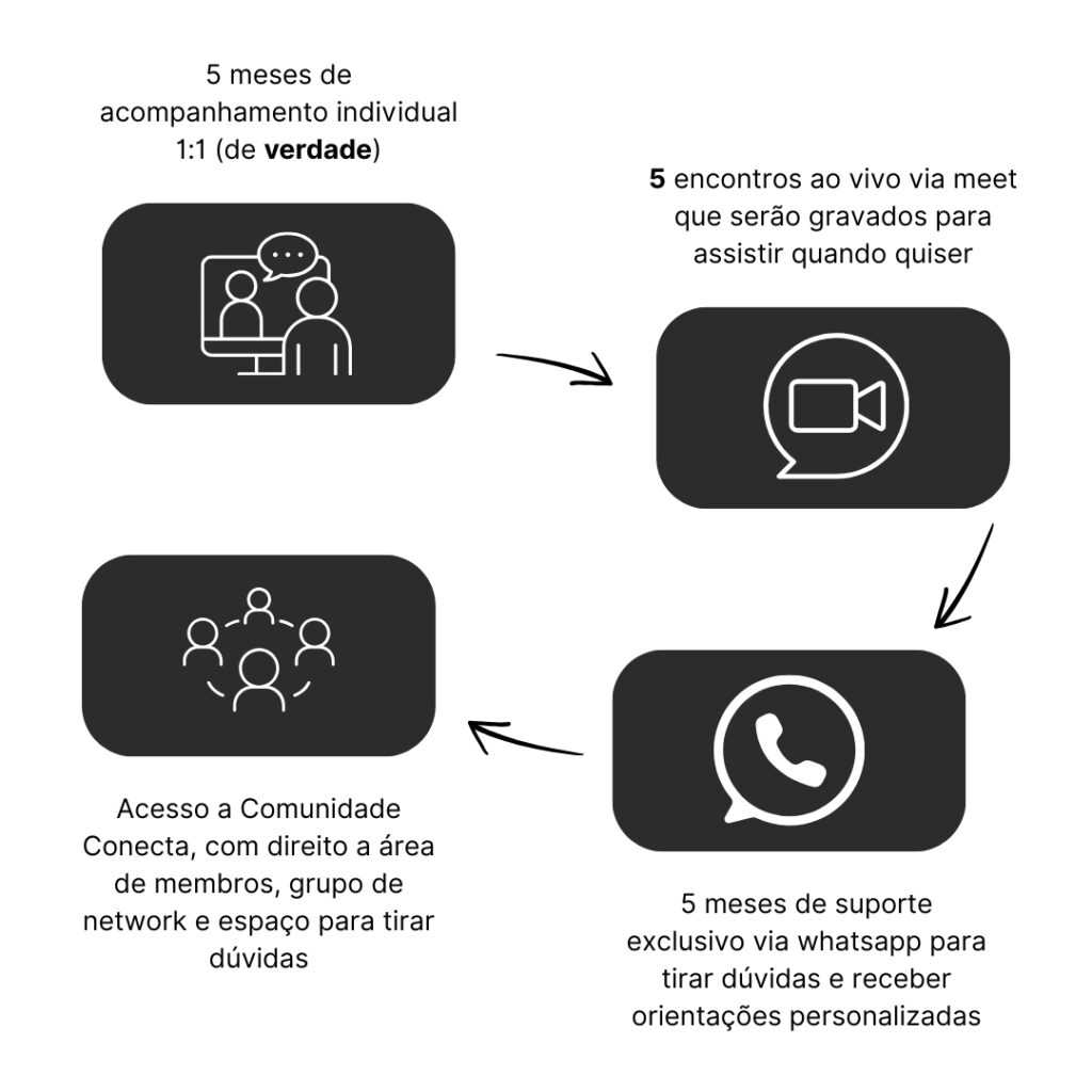 Esse valor inclui todo o acompanhamento de 5 meses na mentoria individual, com suporte exclusivo, encontros mensais, e acesso completo à Comunidade Conecta — com curso, e-books, workshops gratuitos e novos conteúdos que serão lançados ao longo dos meses.